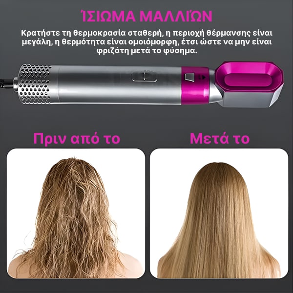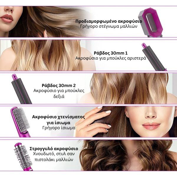 Είναι ιδανικό για όλους τους τύπους μαλλιών, και οι 5 διαφορετικές προσθήκες σας δίνουν τη δυνατότητα να στεγνώσετε, να κατσαρώσετε, να ισιώσετε, να δώσετε όγκο και να διαμορφώσετε τα μαλλιά σας.