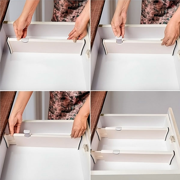 Θα μεταμορφώσετε τα ακατάστατα συρτάρια σας σε δευτερόλεπτα. Με μια απλή εγκατάσταση “κίνηση και κλικ”, η οργάνωση δεν ήταν ποτέ πιο εύκολη. Απλά τοποθετήστε, ρυθμίστε και ασφαλίστε το διαχωριστικό στη θέση του – δεν χρειάζονται εργαλεία ή κόλλα.