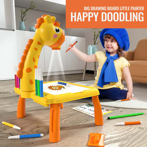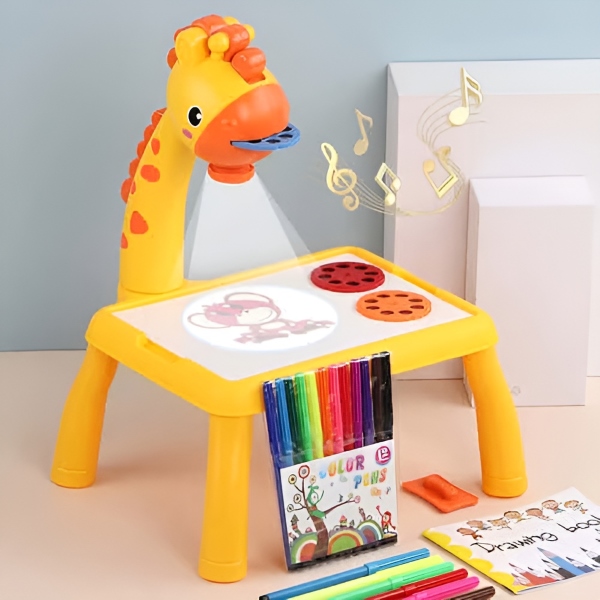 Ένας πολύχρωμος προβολέας με θέμα την καμηλοπάρδαλη, σχεδιασμένος να τραβά την προσοχή και να προσφέρει διασκέδαση στα παιδιά, ενισχύοντας τη λεπτή κινητικότητα και τη γνωστική τους ανάπτυξη.