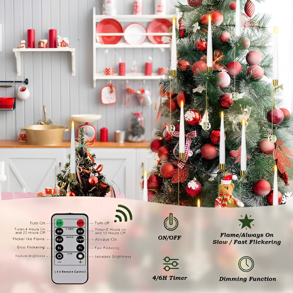 Με το τηλεχειριστήριο 10 πλήκτρων, ρυθμίστε τη φωτεινότητα των κεριών, επιλέξτε ανάμεσα σε τέσσερις λειτουργίες φωτισμού και ορίστε χρονοδιακόπτες για 4 ή 6 ώρες, εξασφαλίζοντας ευκολία και ευελιξία στη διακόσμηση.